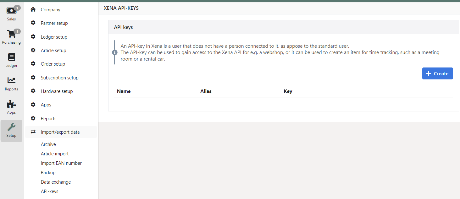 After you log in, enter the menu Setup > Import/export data > API-keys